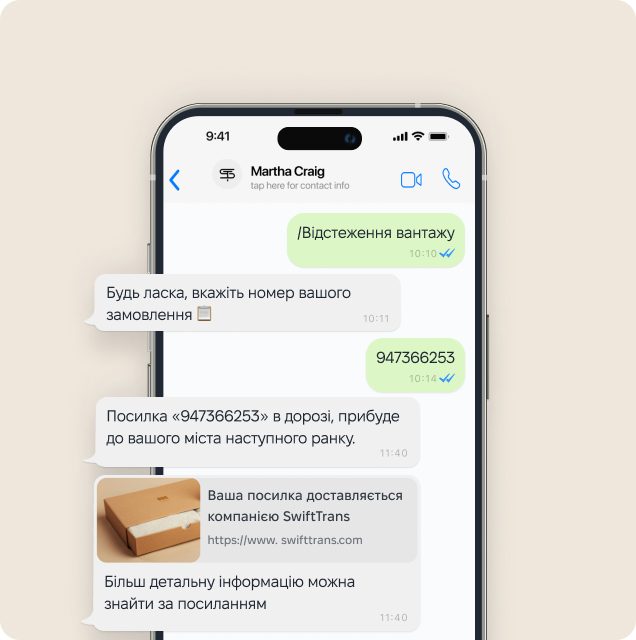 - Інтеграція з CRM системою на вибір: отримання статусів замовлень з CRM до чат-бота, додавання нової заявки з чат-бота до CRM.