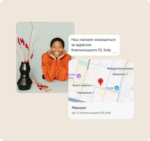 Спрямуйте запити до месенджера, щоб розвантажити підтримку. Чат-бот ефективно обробляє запити щодо інформації про компанію, графіку роботи, оплати, адреси та контактів.