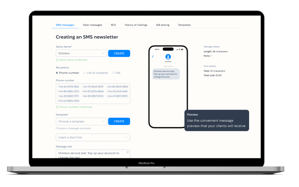 Select an alpha name from Octotoo's collection or create your own unique identifier for personalised messaging tailored to your brand.