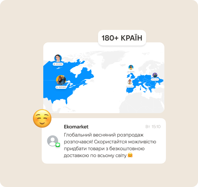 Надсилайте повідомлення по всьому світу без зайвих зусиль у понад 180 країн та на номери 1000+ операторів. Розширюйте свою глобальну присутність за допомогою нашого комплексного сервісу. Безперешкодно спілкуйтеся з клієнтами, де б вони не знаходилися.