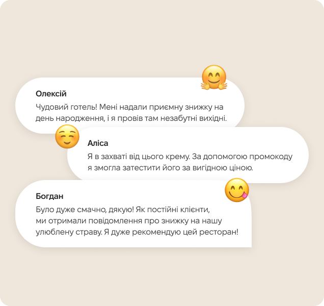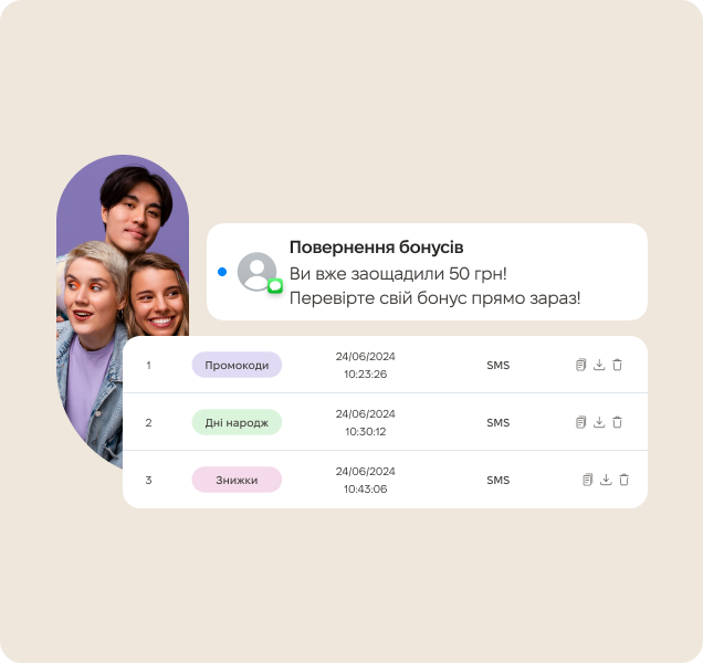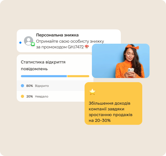 Надсилайте персоналізовані повідомлення на основі хобі, інтересів та історії покупок, щоб підвищити лояльність клієнтів. Згідно з опитуванням, понад 59% клієнтів здійснили покупку в магазині після отримання SMS.